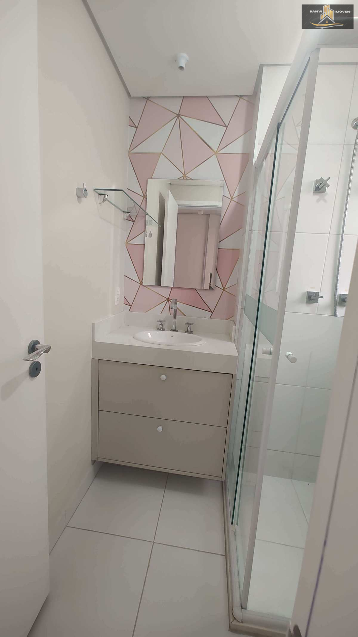 - Lavabo com gabinete planejado, parede em pastilhas redondas